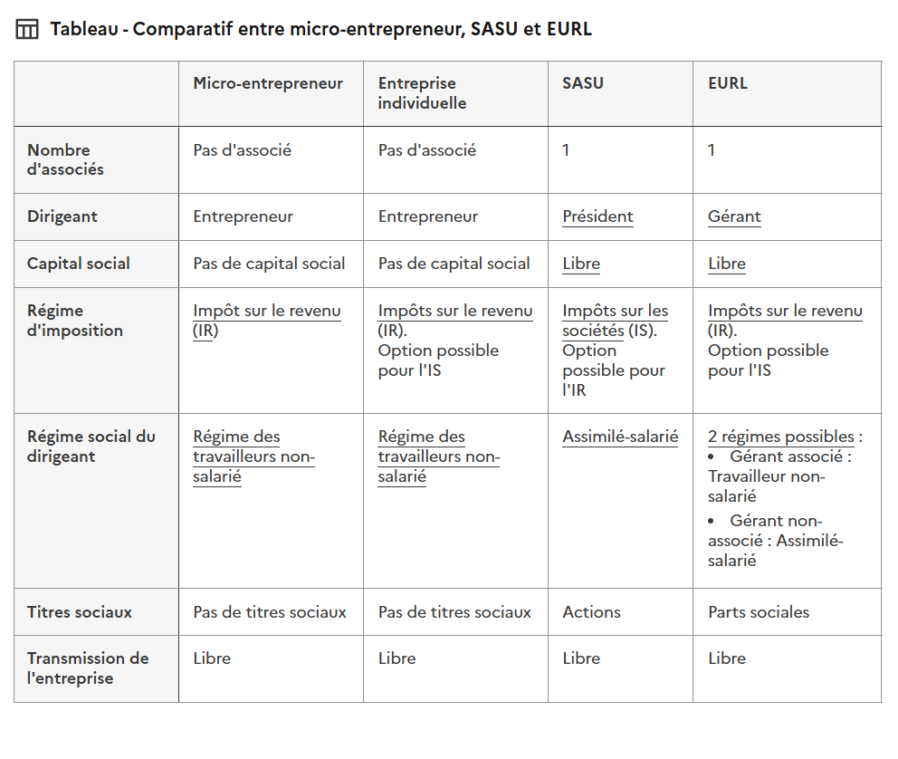 6. Différences entre micro-entrepreneur, SASU et EURL (tableau)